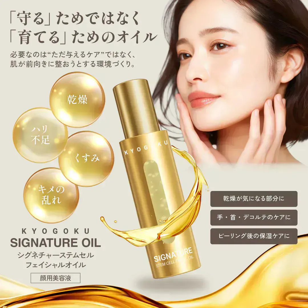 乾燥肌の悩みは、日々の生活習慣やスキンケアを見直すことで、確実に改善へと導くことができます。特に、先進の美容成分「ヒト幹細胞由来成分」と「スクワラン」を配合したKYOGOKU シグネチャーステムセル フェイシャルオイルは、乾燥によるつっぱり感やハリ不足、くすみといった複合的な肌悩みにアプローチし、内側から輝くような潤いとハリを与えてくれるでしょう。