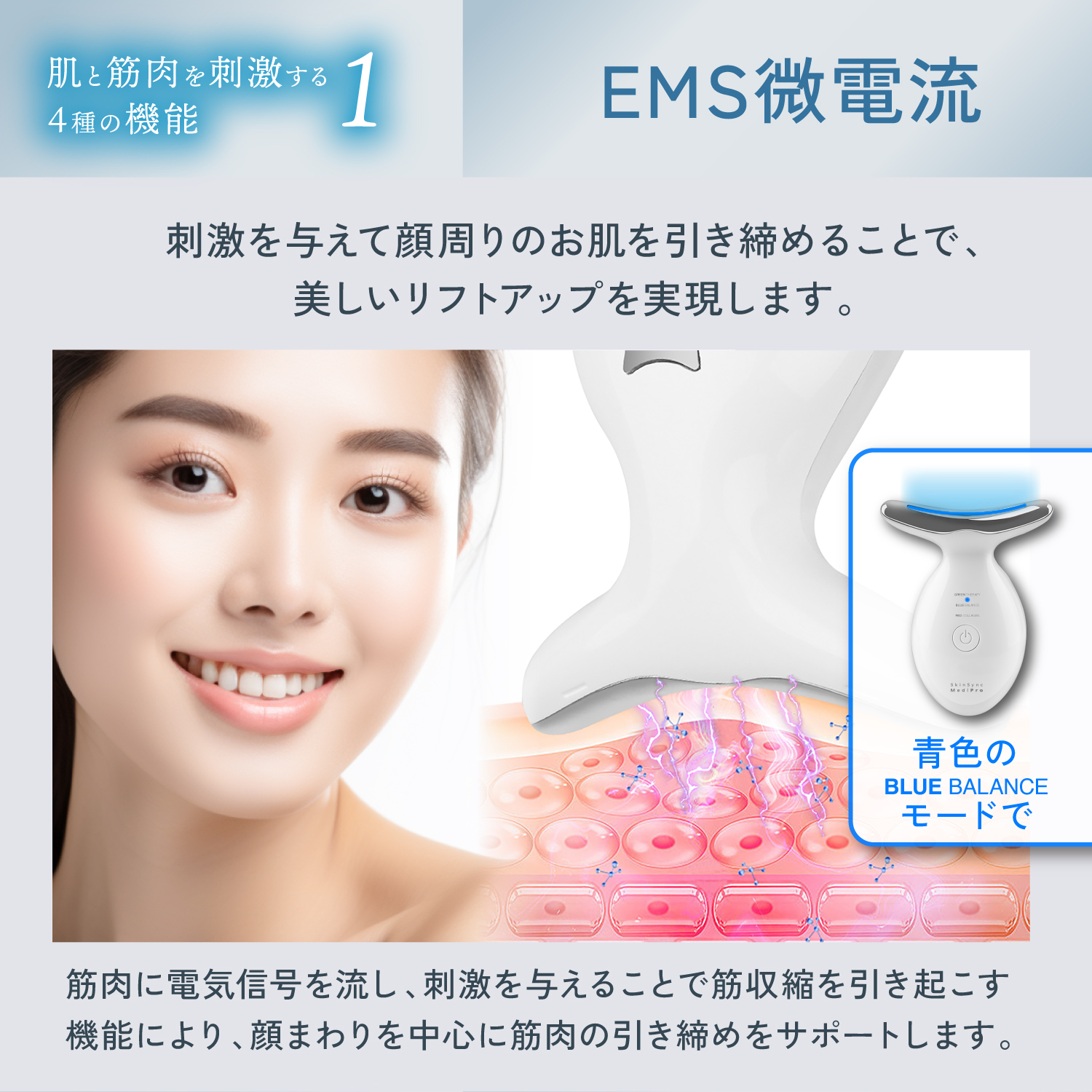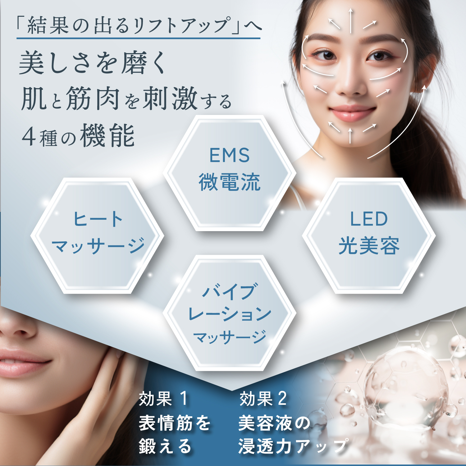 上記4つの機能で、普段あまり使わない表情筋を刺激し、リフトアップの手助けをします。