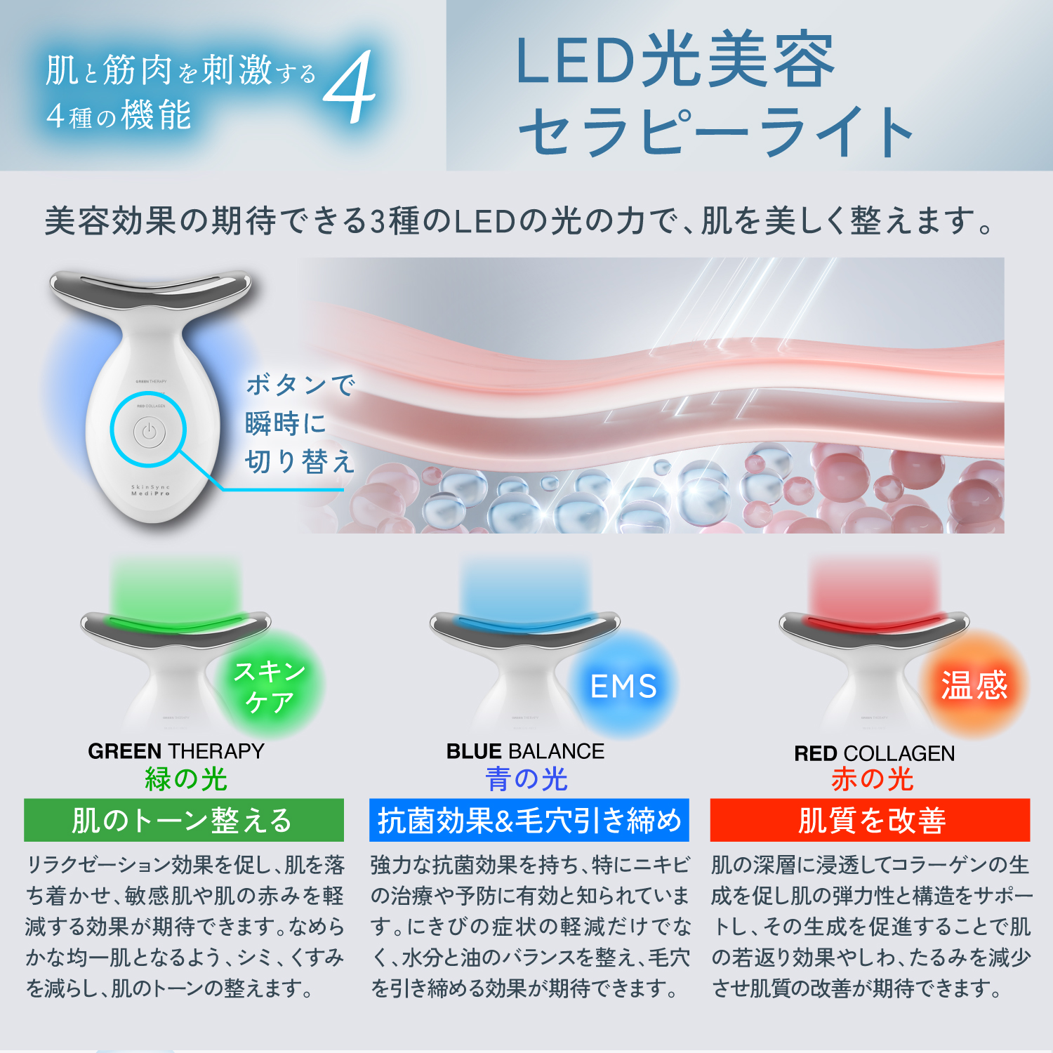 - LED(赤・青・黄):肌悩みに合わせた3色LEDでトータルケア。