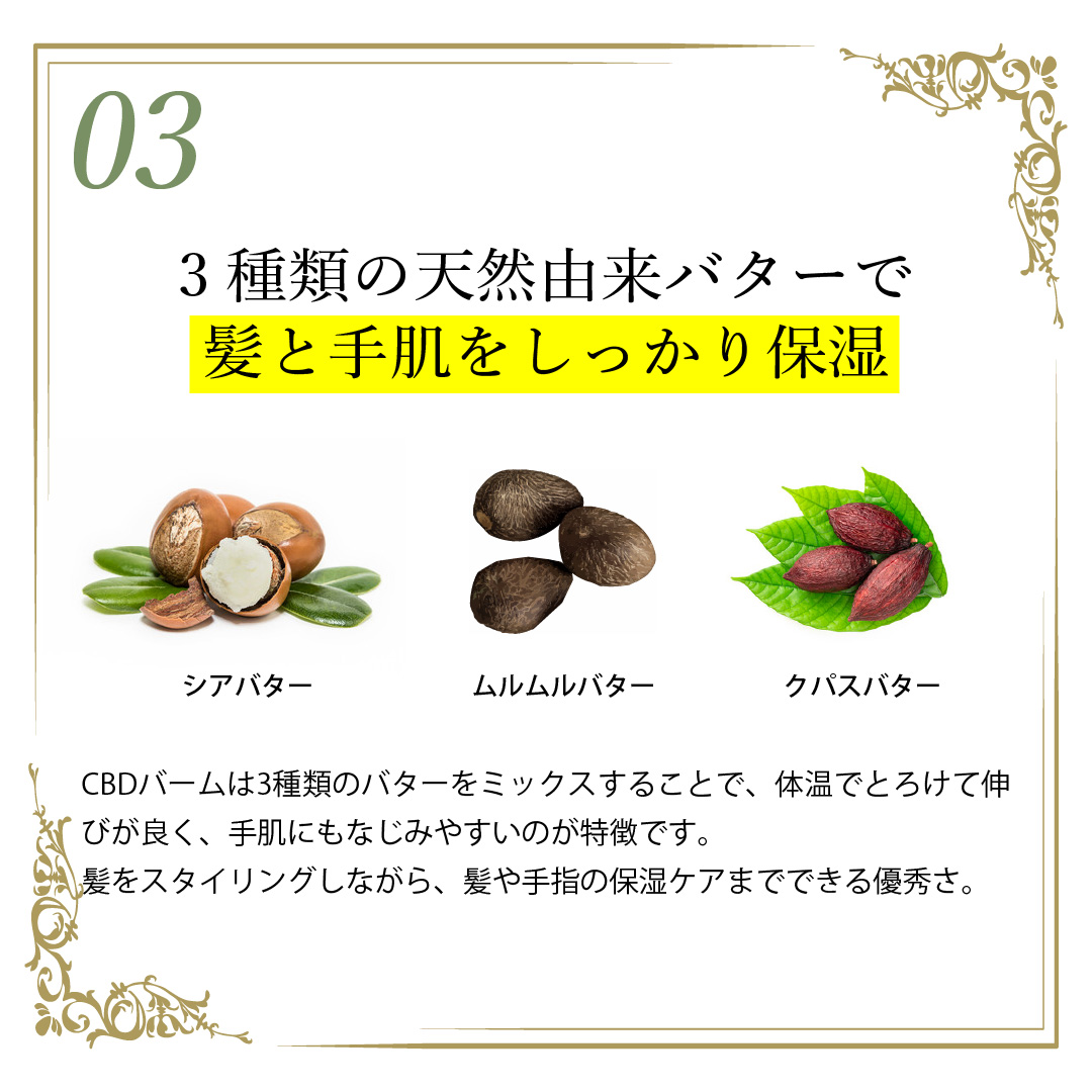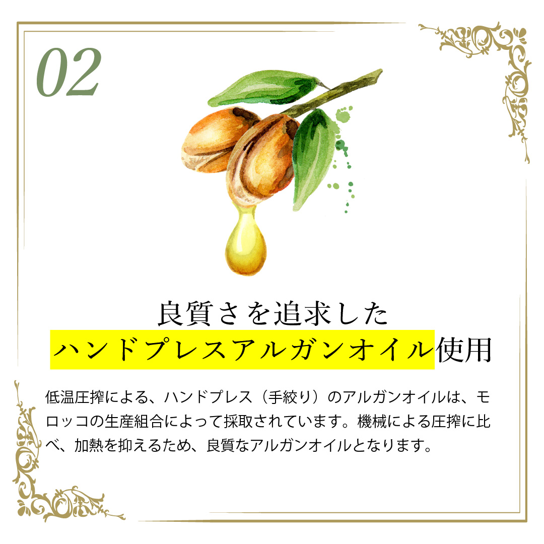 ハンドプレスト(手絞り)のアルガンオイルをこだわって使用したバーム。天然バターのシア脂を使用し、髪や肌の潤いを保ちます。