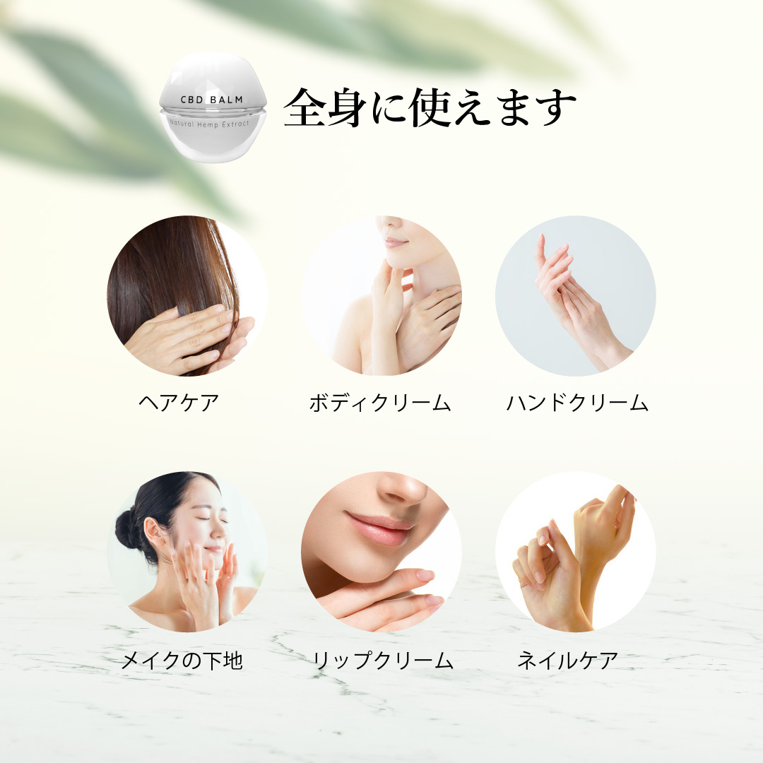 シア油、(カプリル酸/カプリン酸)ヤシアルキル、ミツロウ、グレープフルーツ果皮油、CBD、アストロカリウムムルムル種子脂、アルガニアスピノサ核油、ホホバ種子油、メドウフォーム-ò-ラクトン、ヒマワリ種子油、ラベンダー油、ニオイテンジクアオイ油、マンダリンオレンジ果皮油、ローズマリー葉油、トコフェロール