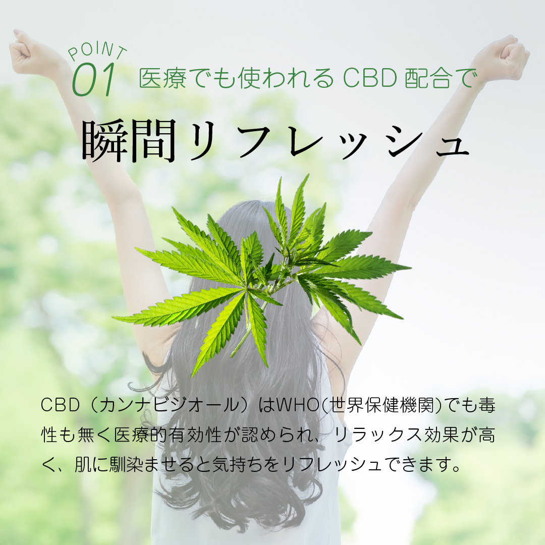 水、スクワラン、シア、ベンテンシリコール、ポリアクリルアミド、カンナビジオール、マンゴー種子脂、テオブロマグランジフロルム種子脂、アストロカリウムムルムル種子脂、アルガニアスピノサ核油、グリセリルアスコルビン酸、合成ヒト遺伝子組換オリゴペプチド -1、プラセンタエキス、ブラウロイルグルタミン酸リシン Na、ポリクオタニウム-61.グリチルリチン酸2K、ラウロイルグルタミン酸ジ(フィトステリル/オクチルドデシル)、ハチミツ、尿素、ホホバ種子油、ローマカミツレ花油、ローズマリー油、ラベンダー油、マンダリンオレンジ果皮
