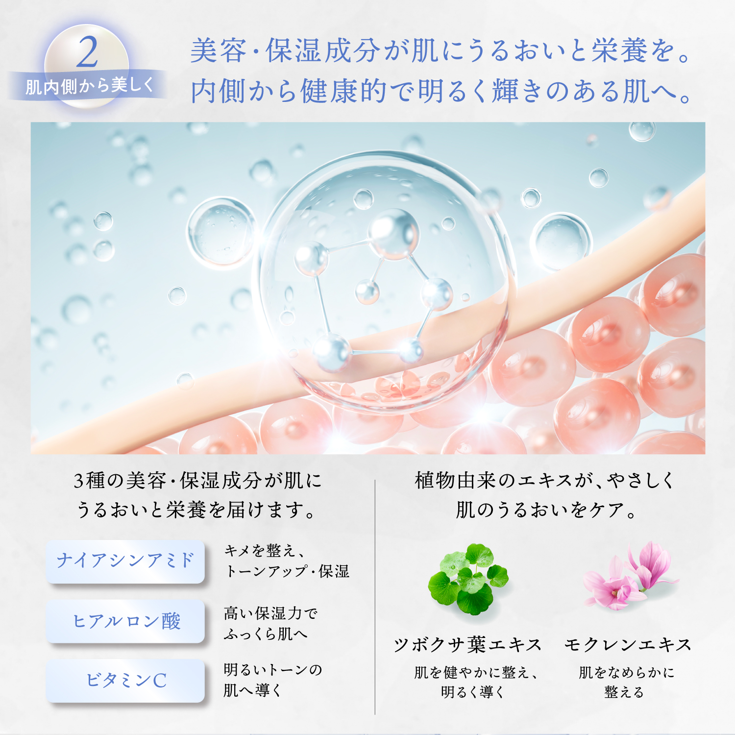 - アルブチン・ビタミンC誘導体などのブライトニング成分が肌のトーンアップをサポート