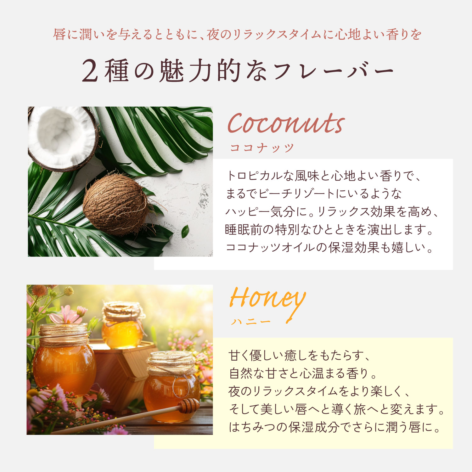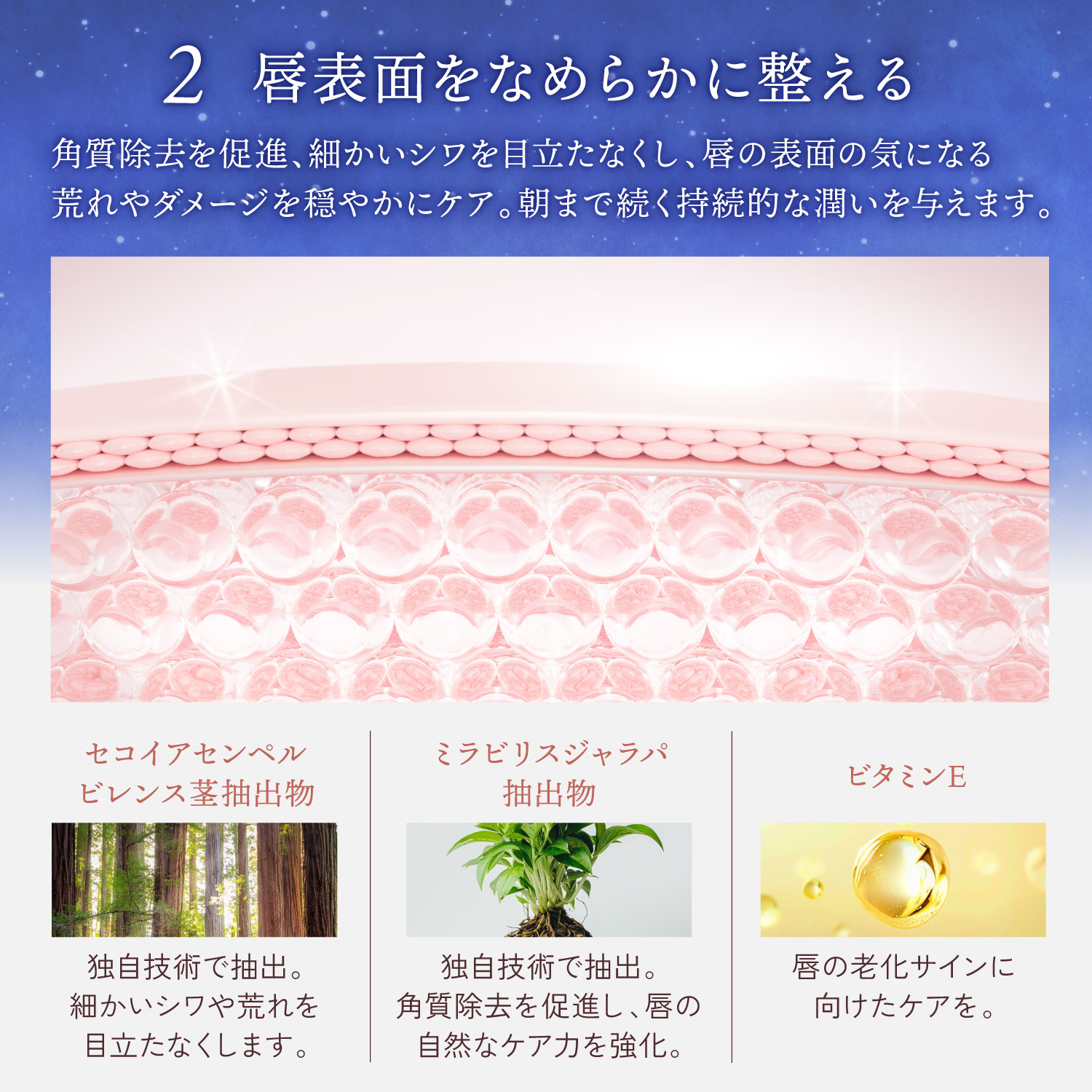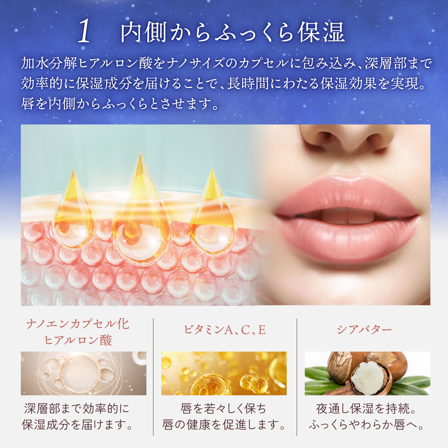 ナノエンカプセル化 ヒアルロン酸、ビタミンA、C、Eやシアバター、スイートチェリー種子油などの成分配合で、寝ている間にふっくらとした柔らかい唇に導きます。