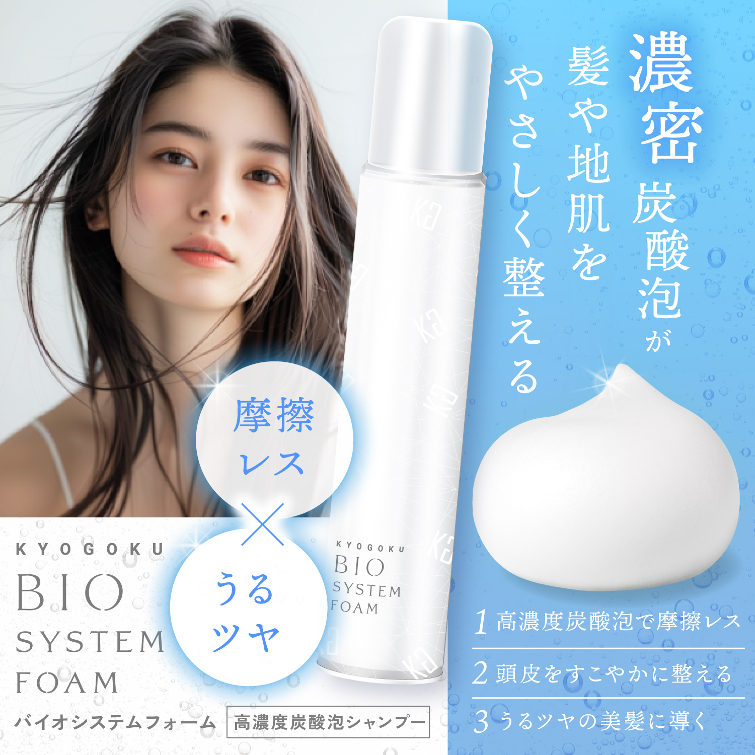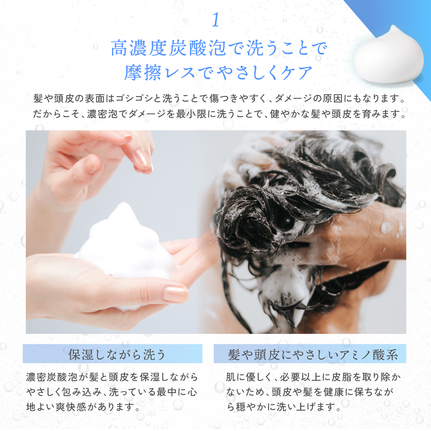 - 繊細な泡が頭皮と髪に密着し、