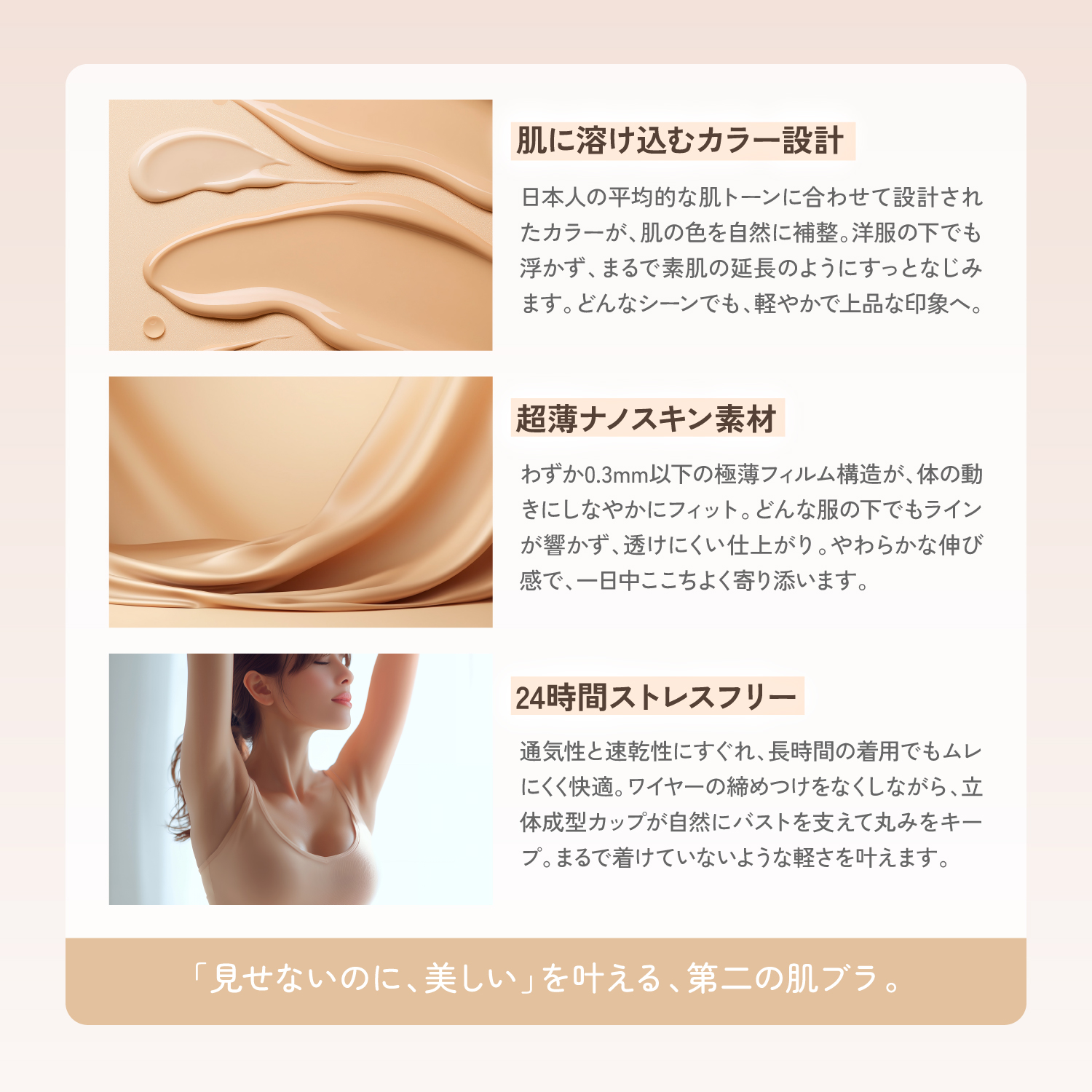 - 肌と一体化するようなセカンドスキン設計で、日常をもっと快適に美しく。」