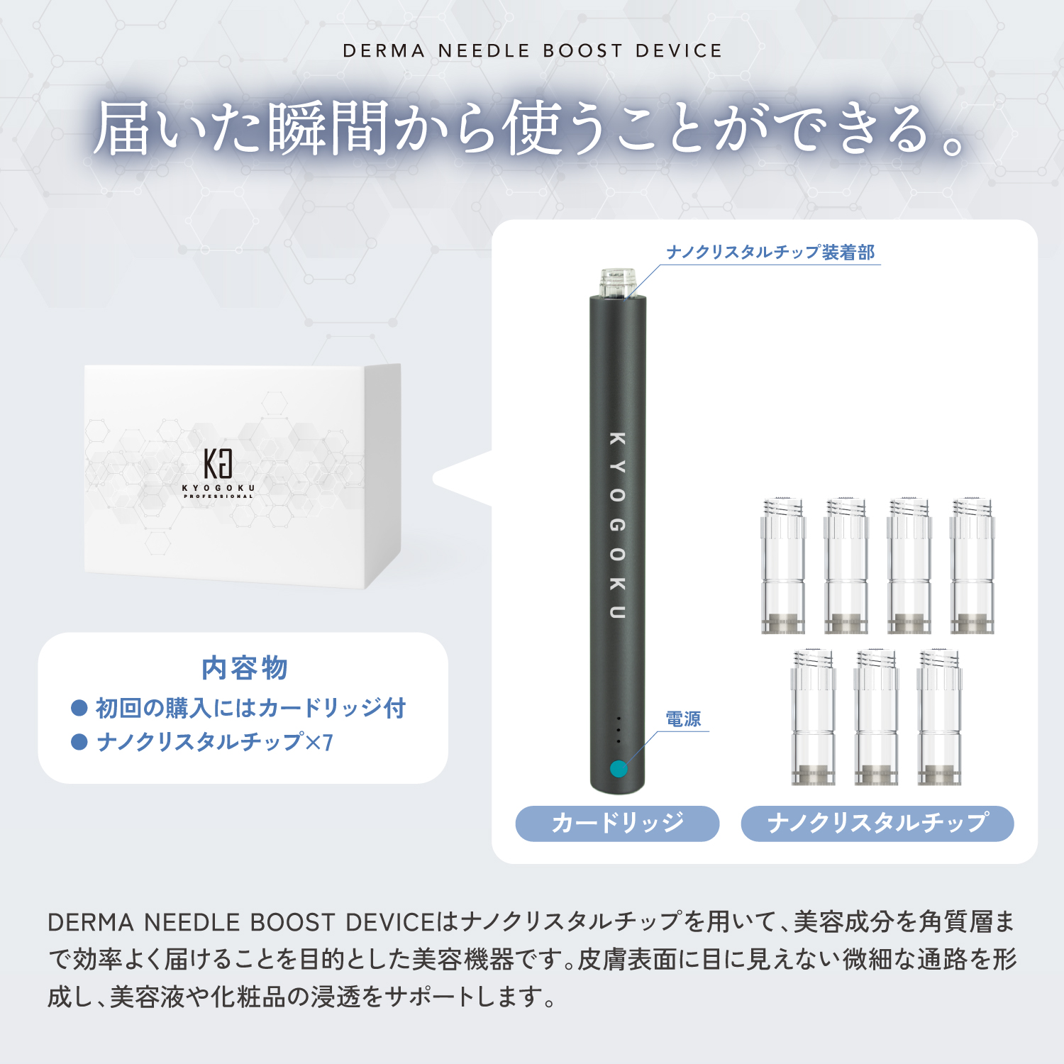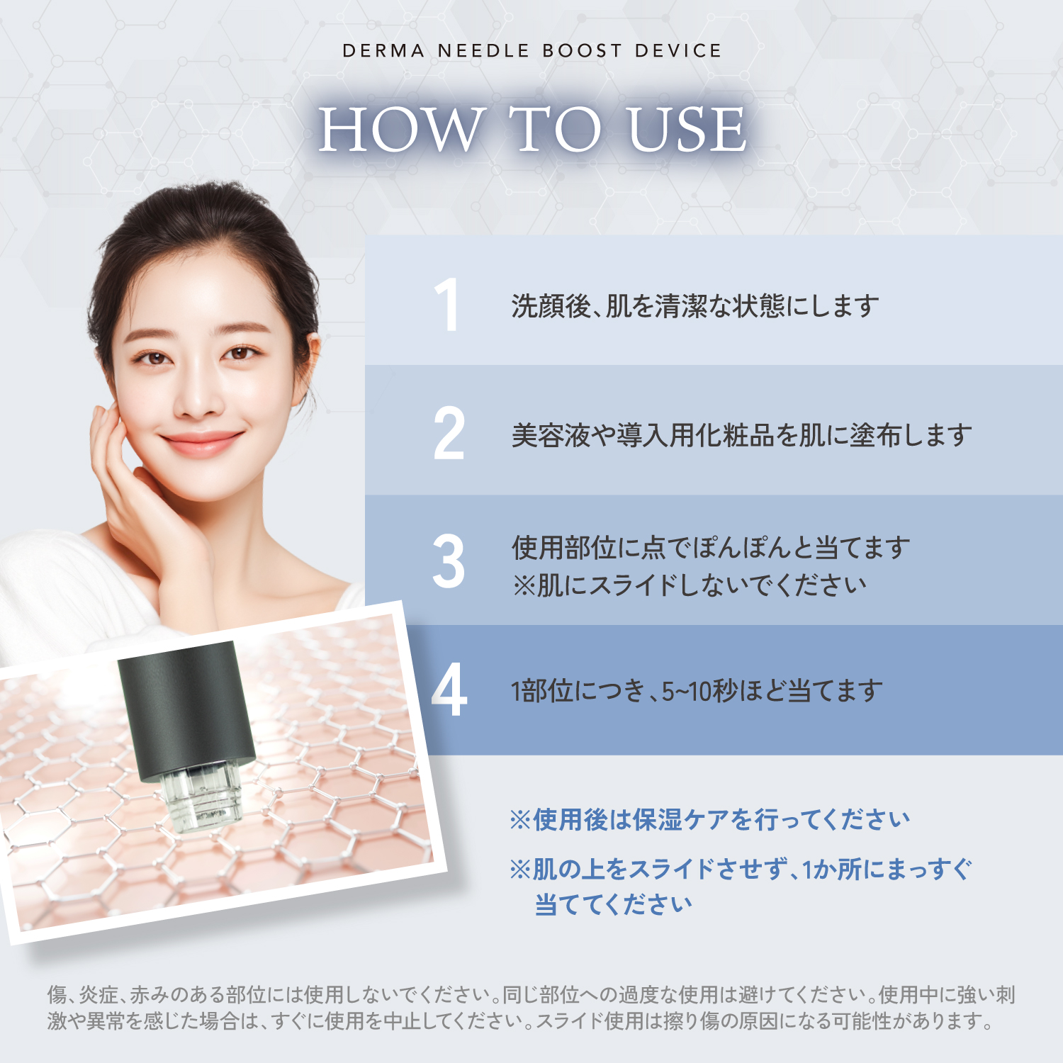 - 美容において大切なのは成分そのものだけでなく、どのような環境で肌に届けるかです。このダーマニードルブーストデバイスは、深すぎず浅すぎない0.18mmという深度設計により、美容液の持つ特性を無駄なく活かすための導入環境を整えることを目的としています。毎日のスキンケアを一段階引き上げたい方にこそ使ってほしいデバイスです。
