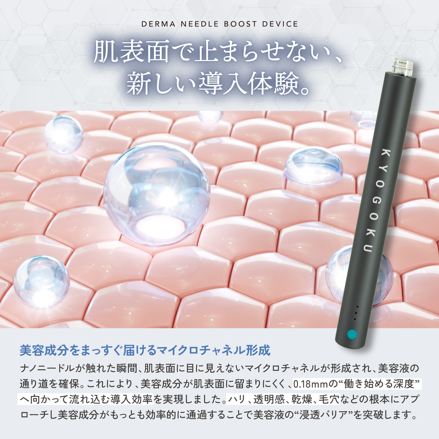 - KYOGOKU ダーマニードルブーストデバイスは、0.18mmという美容成分が働き始めやすい深度に着目したナノダーマニードル構造を採用しています。角質層から表皮浅層にかけて微細な導入経路を形成することで、肌バリアを必要以上に傷つけることなく、美容成分が通りやすい環境を整える設計です。ナノ精密工学と皮膚科学の考え方を融合し、従来の塗布中心のケアから導入環境を整えるケアへと発想を転換した美容デバイスです。