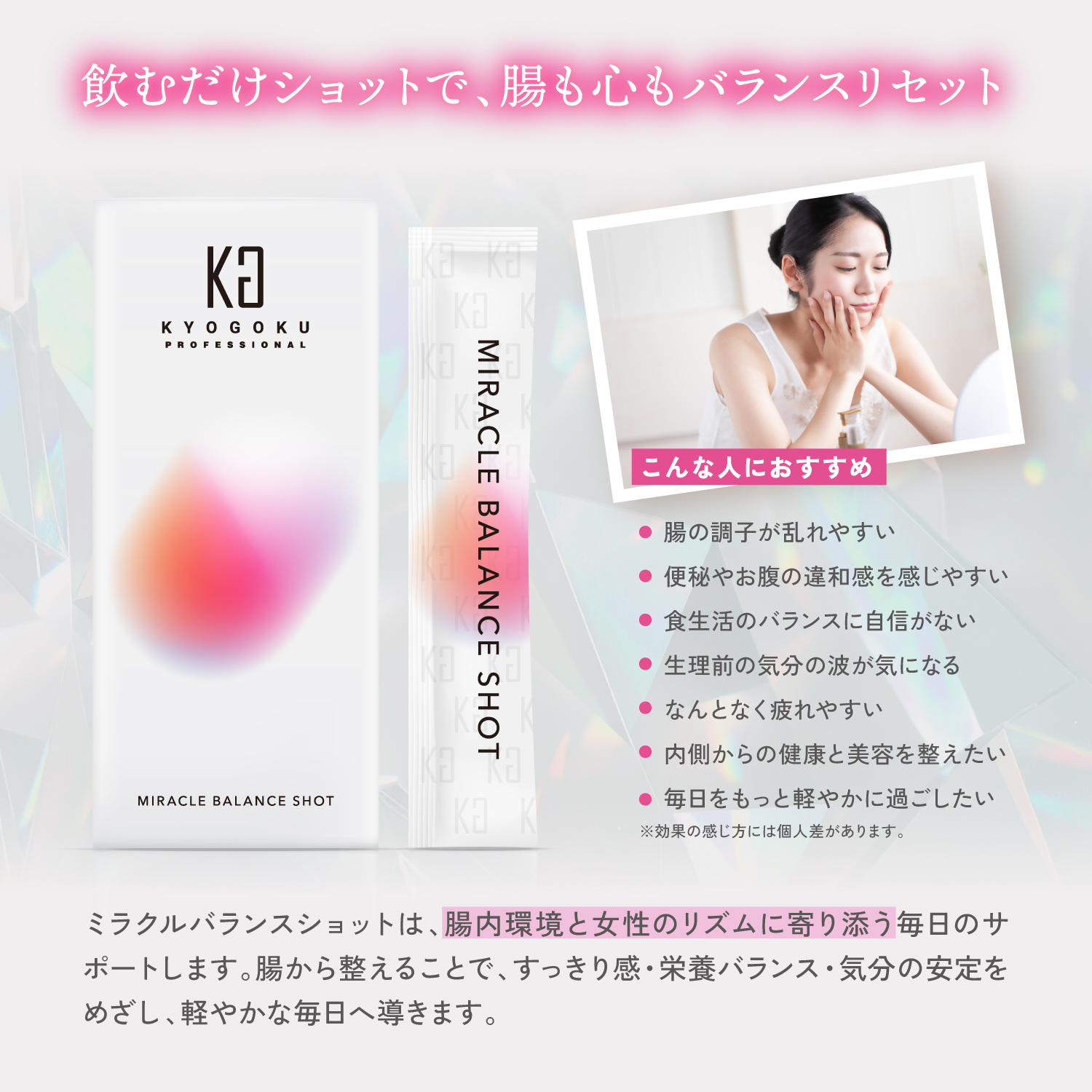 - KYOGOKU 腸活ミラクルバランスショットは、腸の働きに着目した設計で、腸内環境のバランスを整えるための成分を組み合わせています。乳酸菌や発酵成分、食物繊維など、腸内フローラを支える素材を配合し、体内リズムと調和を目指したバランスサポートを重視しています。ホルモンバランスや女性特有のゆらぎ期にも働きかけ、日々のコンディションを整える習慣に寄り添います。