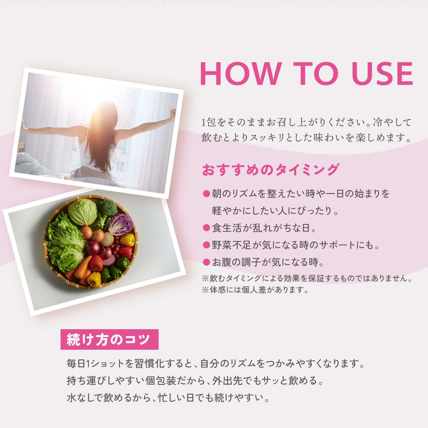 - 毎日の生活習慣として、主に朝のタイミングでお飲みください。飲みやすいショットタイプで、手軽に取り入れられるように設計されています。水やお好みの飲料と一緒にお召し上がりいただいても構いません。ご自身の体調やライフスタイルに合わせて継続的にお使いください。