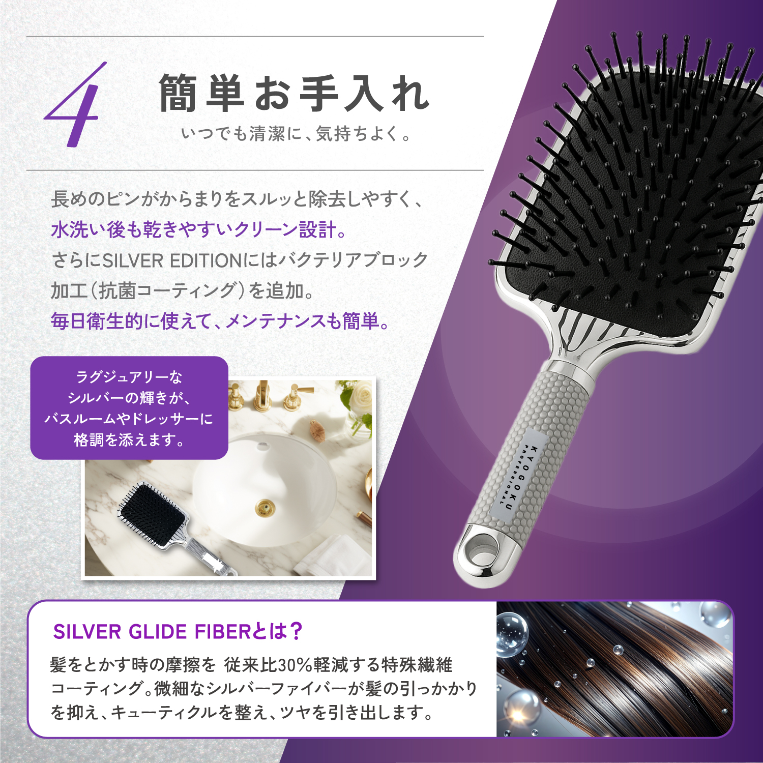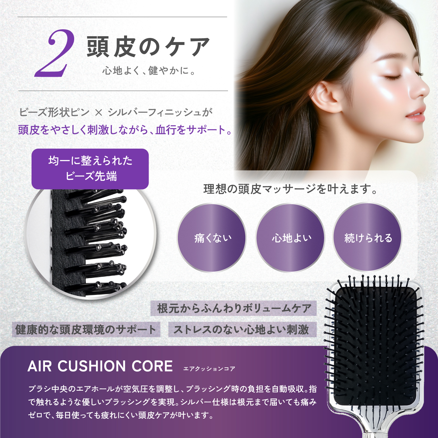パドルのような形状に並んだ長めのピン(クシ歯)が、絡まった髪をほどきやすくすると同時に、ブロードライやスタイリング時の髪や頭皮への負担を緩和するようデザインされています。