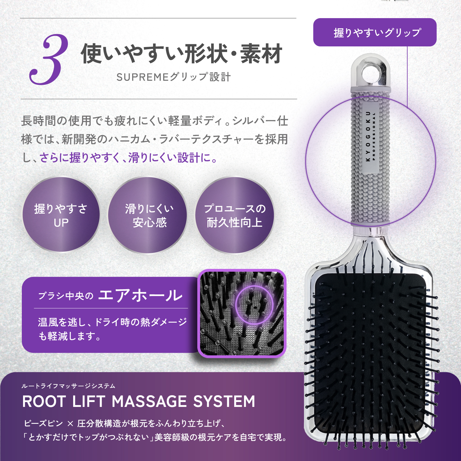 パドルのような形状に並んだ長めのピン(クシ歯)が、絡まった髪をほどきやすくすると同時に、ブロードライやスタイリング時の髪や頭皮への負担を緩和するようデザイン。