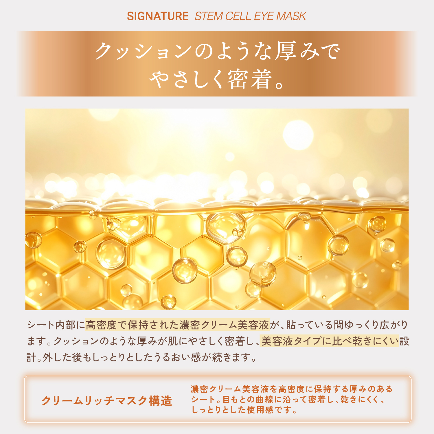 - 目元は肌の中でも特に薄く、日々の表情や環境の影響を受けやすい部位です。シグネチャーアイマスクは、ヒト幹細胞由来成分をはじめとする美容成分と高密着設計で、目元の環境を整えることを目指しました。毎日のスキンケアに取り入れることで、目元印象がよりクリアに、健やかに整うことを期待しています。