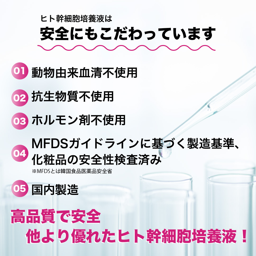 動物由来血清不使用。抗生物質不使用。ホルモン剤不使用、安心の国内製造。
