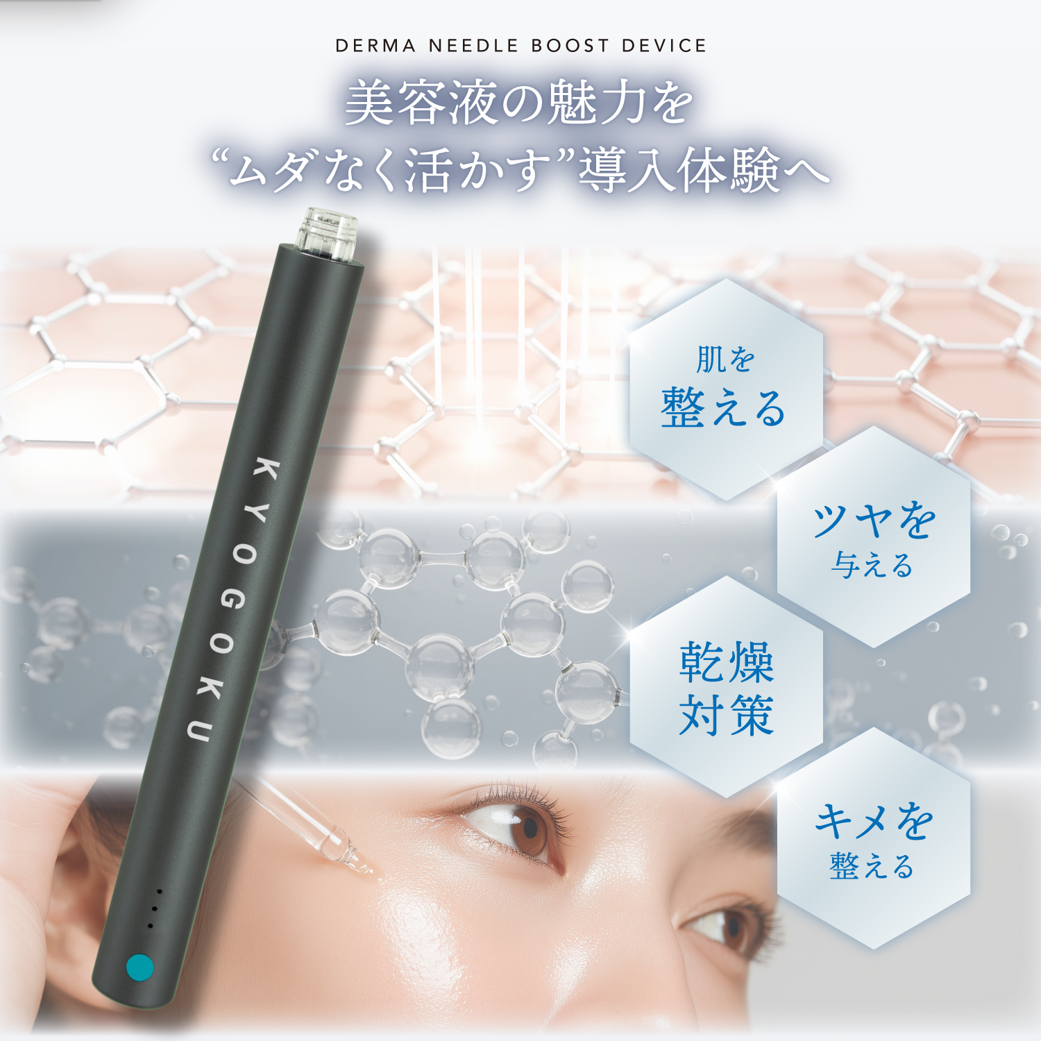 - KYOGOKU ダーマニードルブーストデバイスは、0.18mmという美容成分が働き始めやすい深度に着目したナノダーマニードル構造を採用しています。角質層から表皮浅層にかけて微細な導入経路を形成することで、肌バリアを必要以上に傷つけることなく、美容成分が通りやすい環境を整える設計です。ナノ精密工学と皮膚科学の考え方を融合し、従来の塗布中心のケアから導入環境を整えるケアへと発想を転換した美容デバイスです。