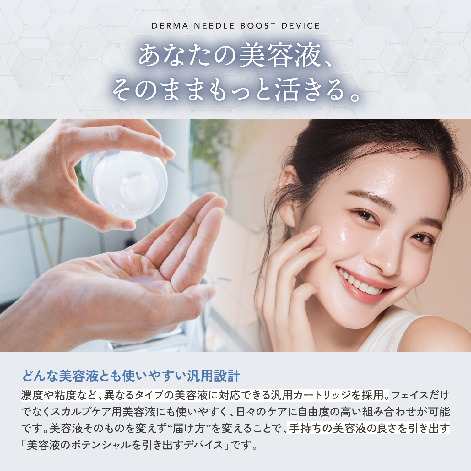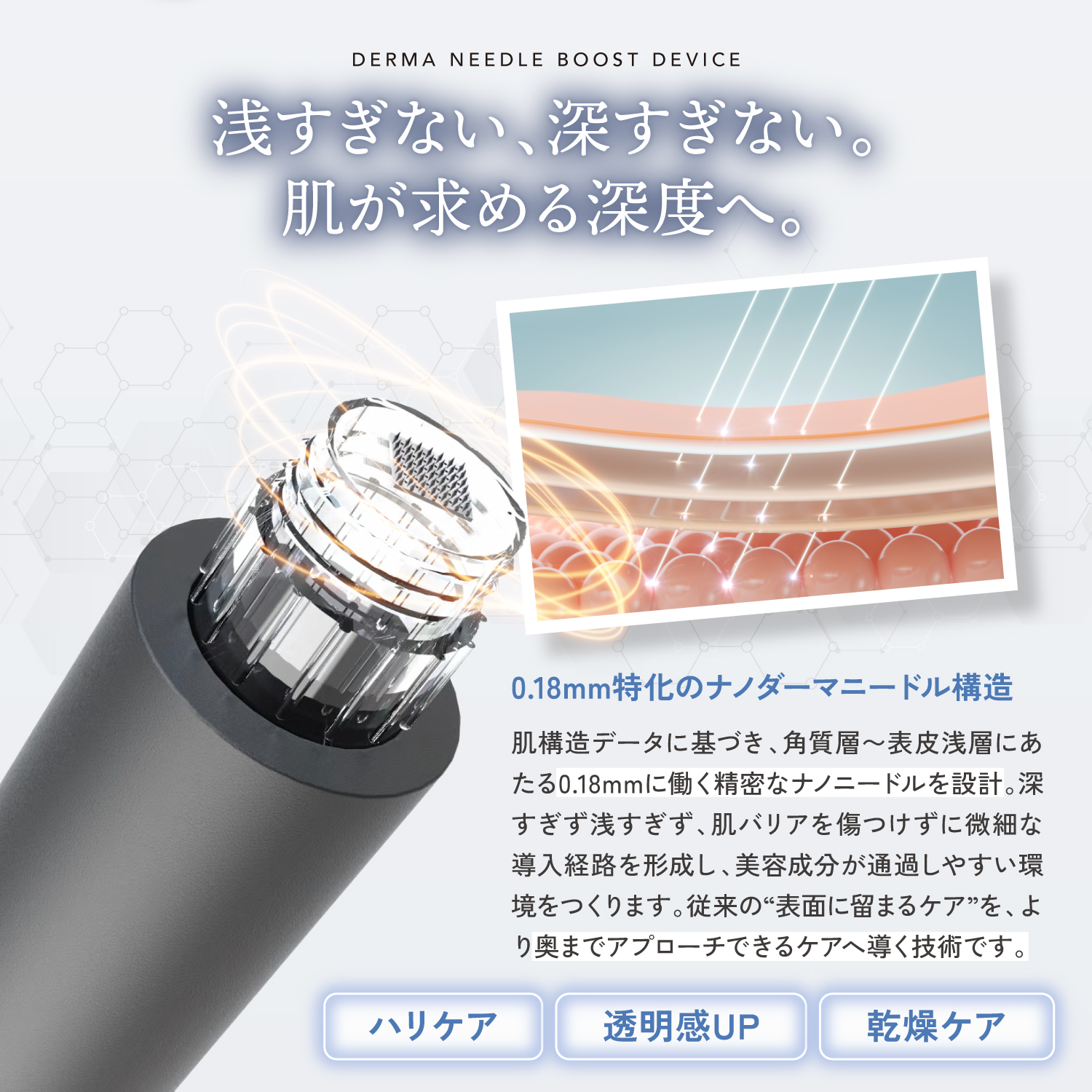 - 美容において大切なのは成分そのものだけでなく、どのような環境で肌に届けるかです。このダーマニードルブーストデバイスは、深すぎず浅すぎない0.18mmという深度設計により、美容液の持つ特性を無駄なく活かすための導入環境を整えることを目的としています。毎日のスキンケアを一段階引き上げたい方にこそ使ってほしいデバイスです。