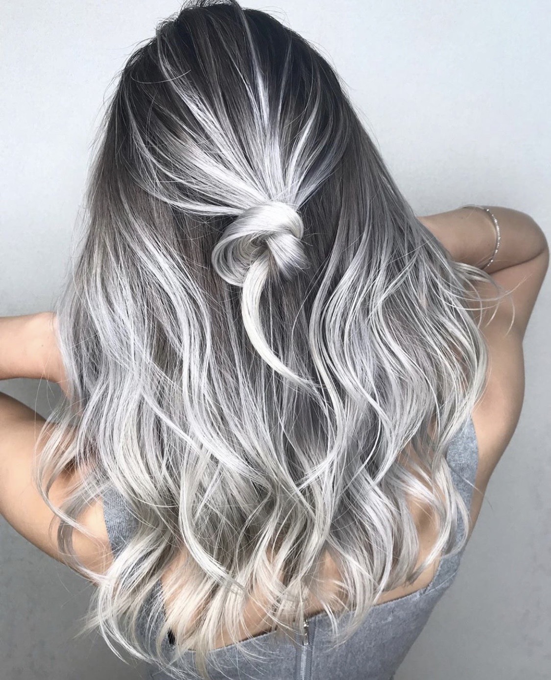 アジア人の髪の毛で、バレイヤージュデザインでホワイト域から様々な美しいカラースタイルを作り出す