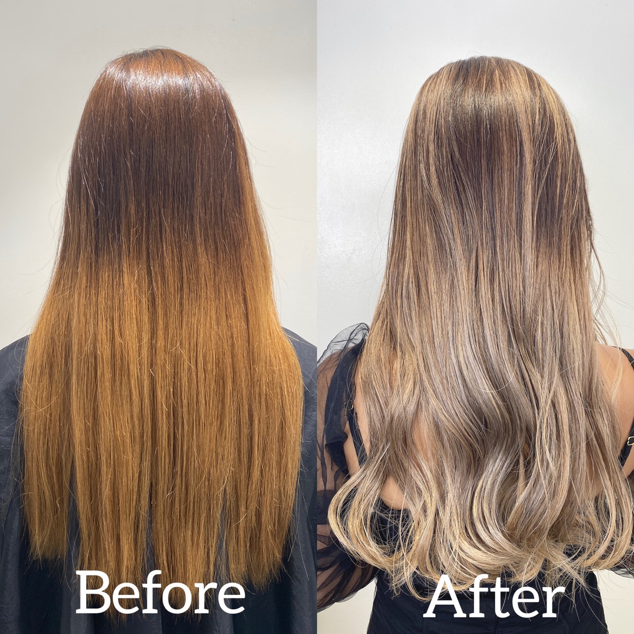 Beforeを見ていただくと中間から毛先はブリーチ履歴があり、根本から中間まではブリーチ履歴無しの部分で今回はこういった場面での提案方法❣️