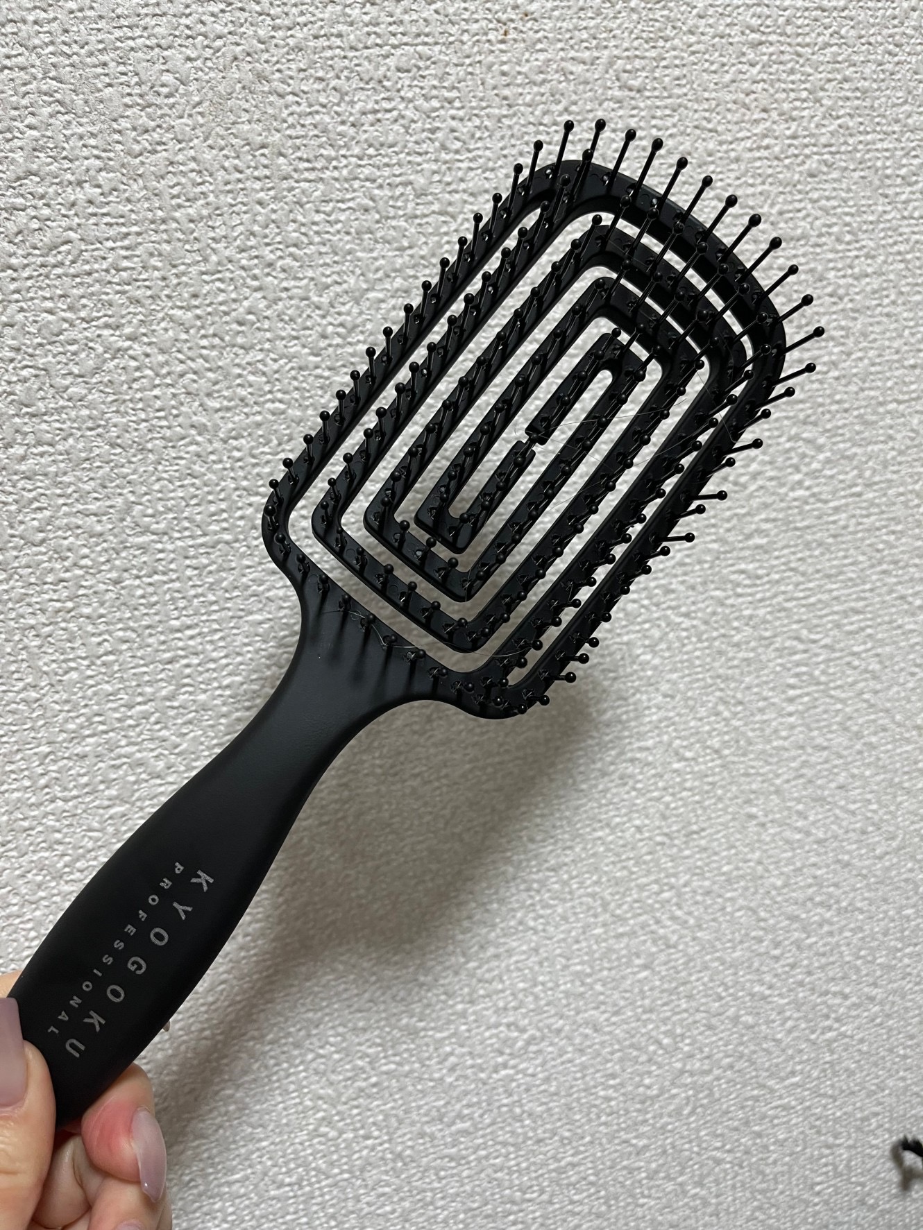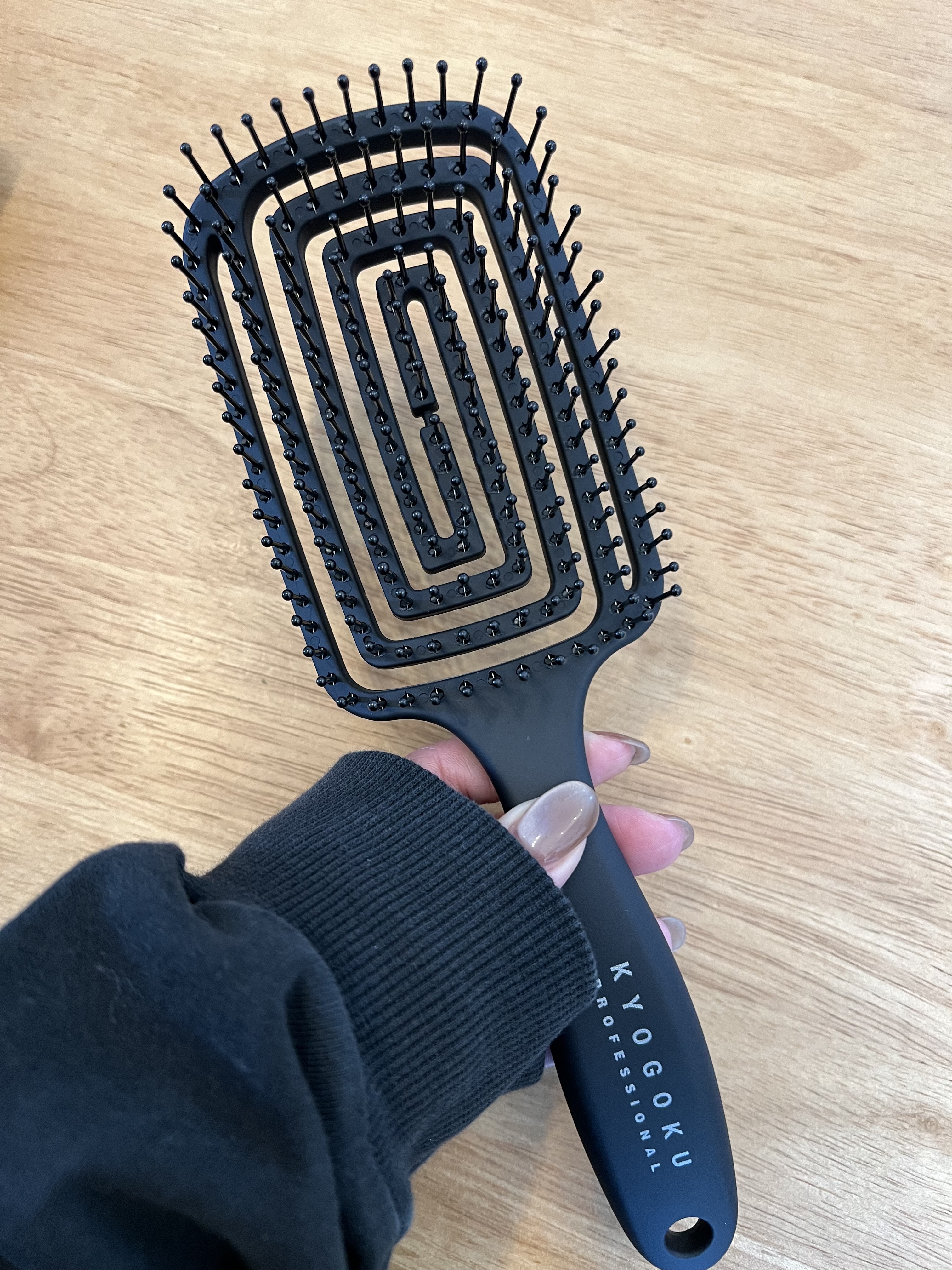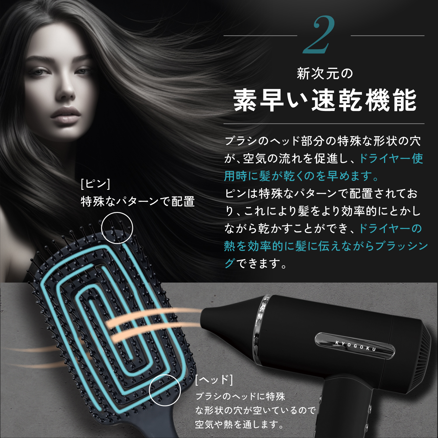 - KYOGOKU エアリードライブラシは、特殊な通気構造(エアフロー設計)と耐熱ナイロンピンを組み合わせた、プロ仕様のブロードライ専用ブラシ。熱がこもらず均一に分散されることで、速乾性とスタイリング力を両立します。さらに、ピンの先端には球状加工を施し、頭皮への負担を最小限に抑えながら髪を根元からふんわり立ち上げます。軽量設計で長時間使用しても疲れにくく、自宅でのセルフブローにも最適です。