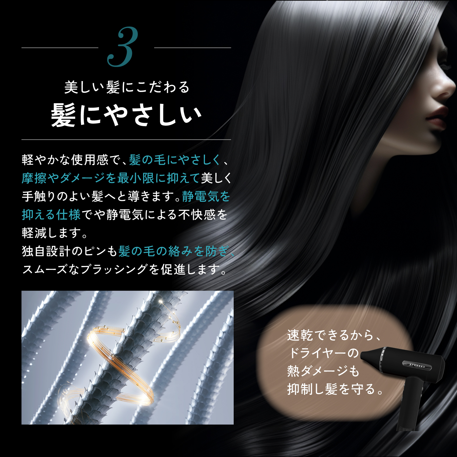 - このエアリードライブラシは、プロが使う技術を誰でも手軽に再現できるように設計しました。髪の質感を一段引き上げる、新しい日常の道具です。」