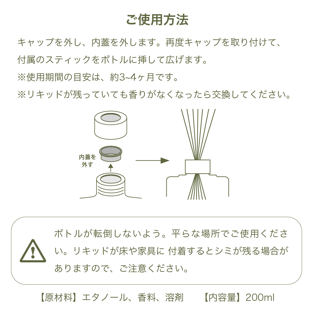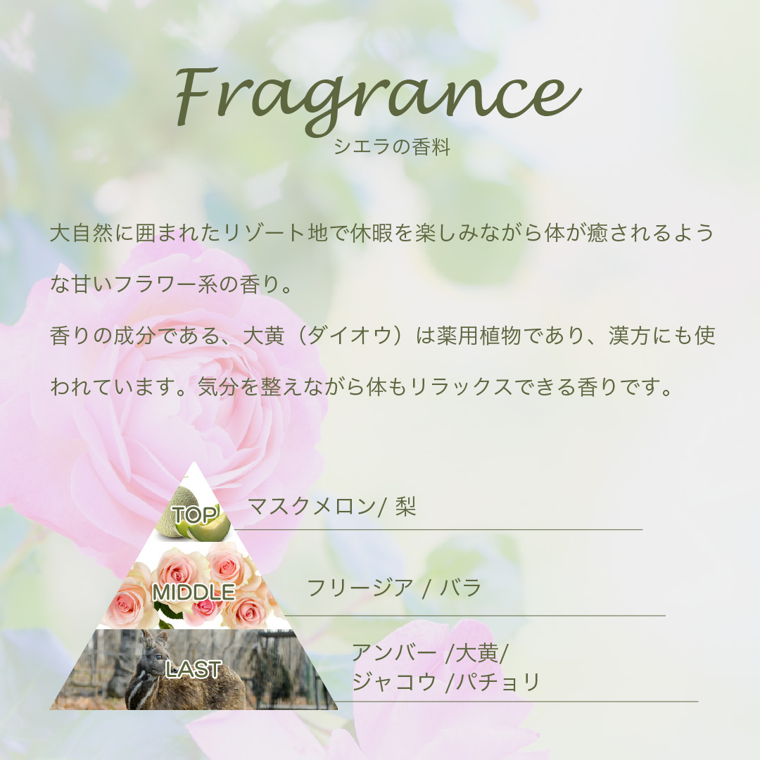 トップはマスクメロン・梨、ミドルはフリージア・バラ、ラストはアンバー・大黄・ジャコウ・パチョリと香りが変化します。